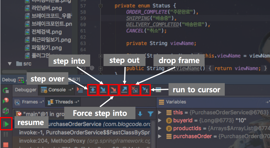 기능 : 다음 실행되는 라인으로 이동하나, step into와 달리 Stepping을 무시하고 진행한다.