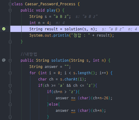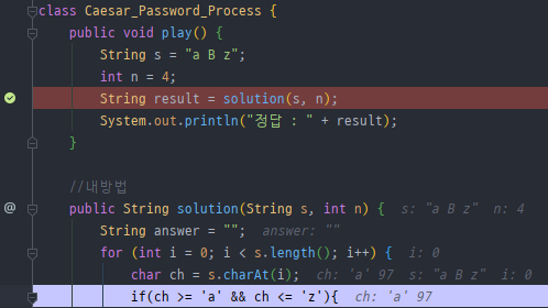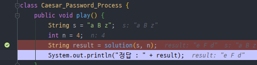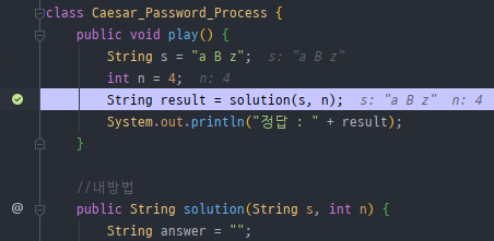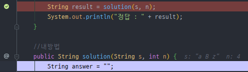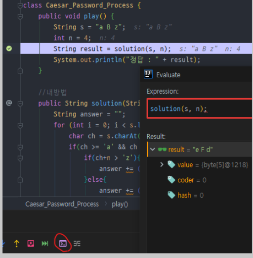 => solution() 메소드가 존재하는 부분에 Break Point를 걸고 evaluate로 solution()결과를 확인했다.