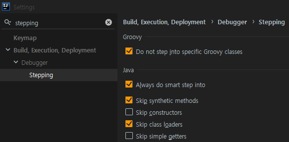 확인이 불필요한 getter , 생성자 등에 skip 옵션을 설정한 뒤, skip이 필요할 때는 step into로,