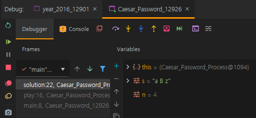 기능 : 현재 break된 라인에서 실행하고 있는 라인( solution() 함수)으로 이동한다.