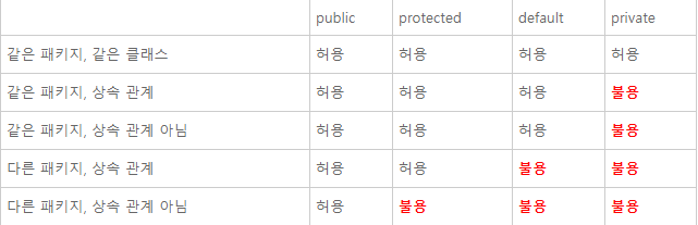 - privte : 같은 패키지의 같은 클래스에서만 접근이 가능하다.