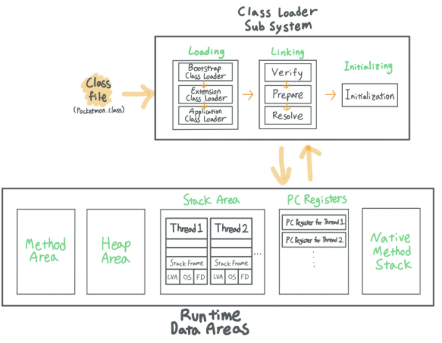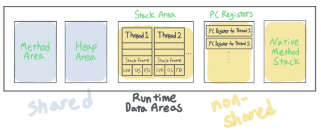 클래스 로드 과정에서 읽힌 클래스 수준의 데이터뿐만 아니라 프로그램에서 사용되는 모든 데이터들이 저장되는 영역이다. 크게 5가지로 나뉘며, 스레드간 공유하는 영역과 스레드별로 개별 할당되는 영역이 존재한다.