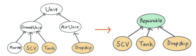 Marine 클래스는 불필요한 repair 메서드를 가지게 된다.