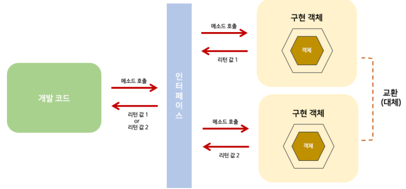 - 부모 타입에 어떤 자식 객체를 대입하느냐에 따라 실행 결과가 달라지듯이, 인터페이스 타입에 어떤 구현 객체를 대입하느냐에 따라 실행결과가 달라짐