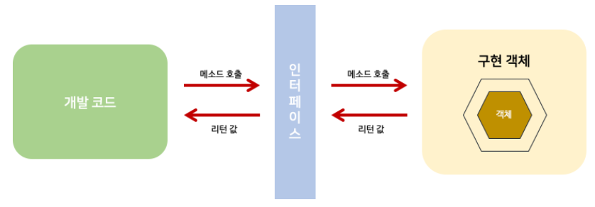 - 이렇게 되면, 개발 코드는 객체의 내부 구조를 알 필요가 없고, 인터페이스의 메소드만 알면 된다는 장점을 가진다.