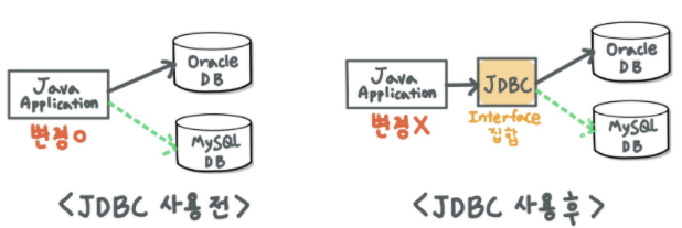 이러한 문제를 해결하기 위해 중간에 JDBC라는 인터페이스 집합(껍데기)을 두기로 했다. JDBC 인터페이스를 각 DB 회사들에게 제공하고, 회사들은 해당 인터페이스에 맞춰서 자사의 서비스를 개발하였다. 이렇게 된다면 어플리케이션을 개발하는 회사는 해당 인터페이스에 맞게 개발하면되기 때문에, JDBC 인터페이스 자체가 변경되지 않는 이상 다양한 종류의 DB를 코드 수정없이 사용할 수 있게 되었다.