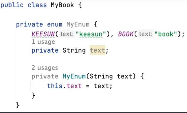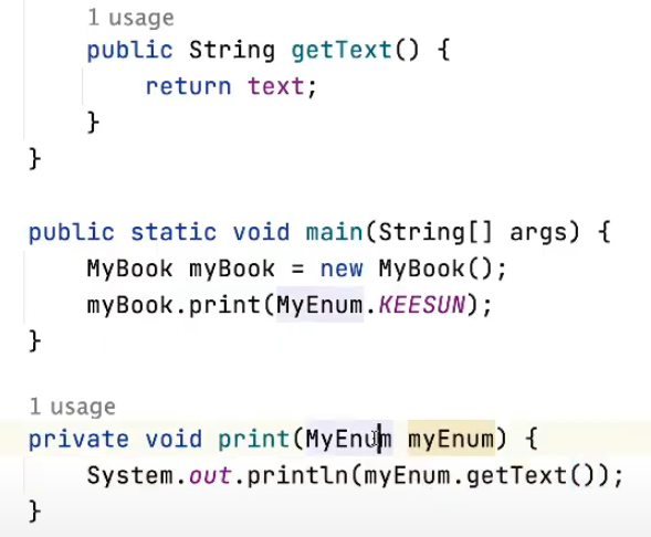 위와 같이 사용할 경우 print()메소드의 매개변수인 MyEnum에는 "KEESUN" or "BOOK"만 들어갈 수 있음