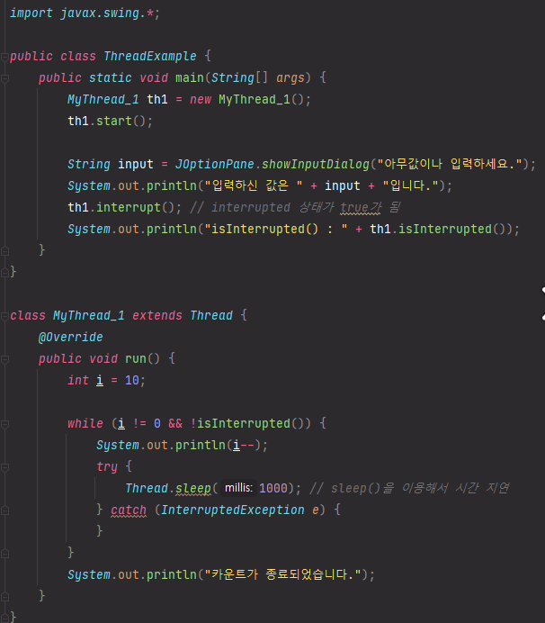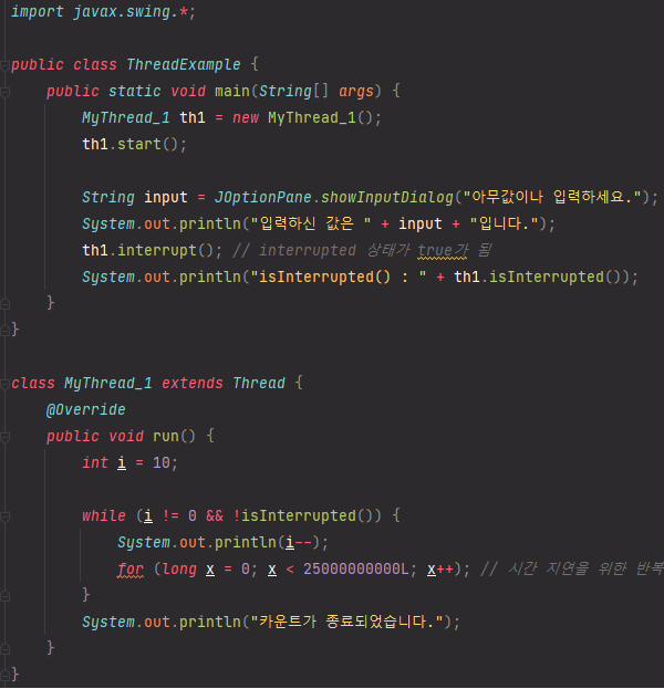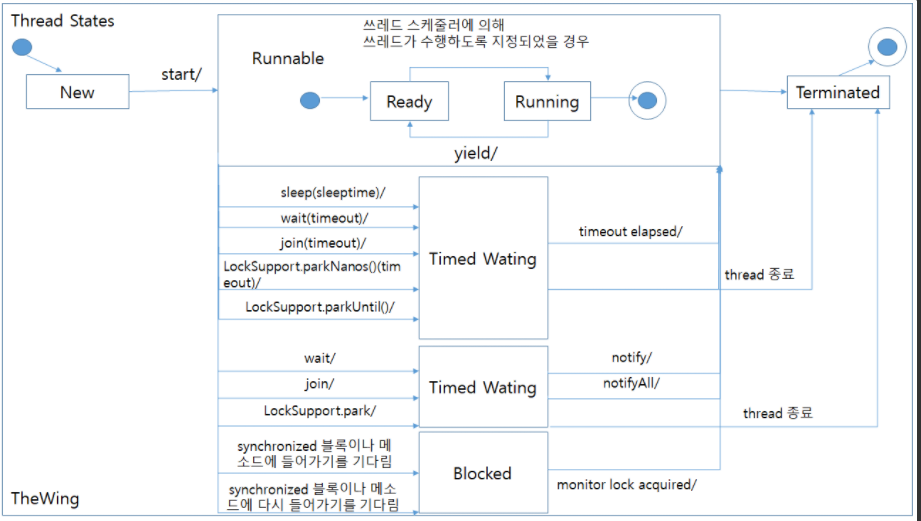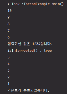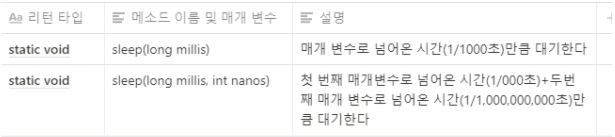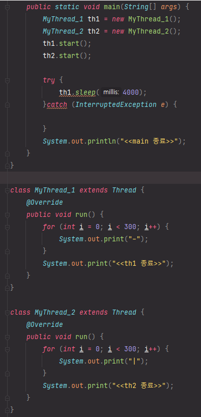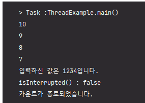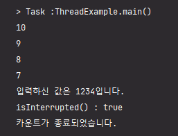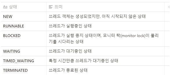 - 데몬 쓰레드가 아닌 모든 쓰레드는 실행된 후 run() 메소드의 작업이 끝나거나 run 메소드 이외에서 예외를 throw 했을 때 종료