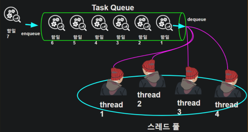 - 스레드가 일이 끝난다고 종료하는게 아니라, queue에 들어간 다른 작업을 할당 받는다.