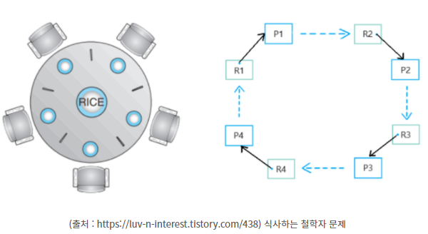 이 문제는 철학자들이 둥근 테이블에 앉아 식사를 하는데 각자의 자리의 왼쪽에 있는 젓가락을 잡은 뒤 오른쪽의 젓가락도 잡아야만 식사가 가능하다는 조건이 있습니다. 모든 철학자들은 왼쪽의 젓가락을 잡고 오른쪽을 쳐다보면 왼손에 젓가락을 들고 오른쪽을 쳐다보고 있는 다른 철학자가 보일것입니다. 결국 오른쪽 젓가락을 잡지 못해 모두 굶어 죽게 될것입니다.