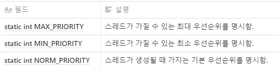 일부 쓰레드에서 실행중인 코드가 새로운 Thread 객체를 생성할 때 새로운 쓰레드는 자신을 생성한 쓰레드의 우선 순위와 동일하게 설정된 우선 순위를 가지며 생성 쓰레드가 데몬쓰레드인 경우 데몬 쓰레드가 된다.