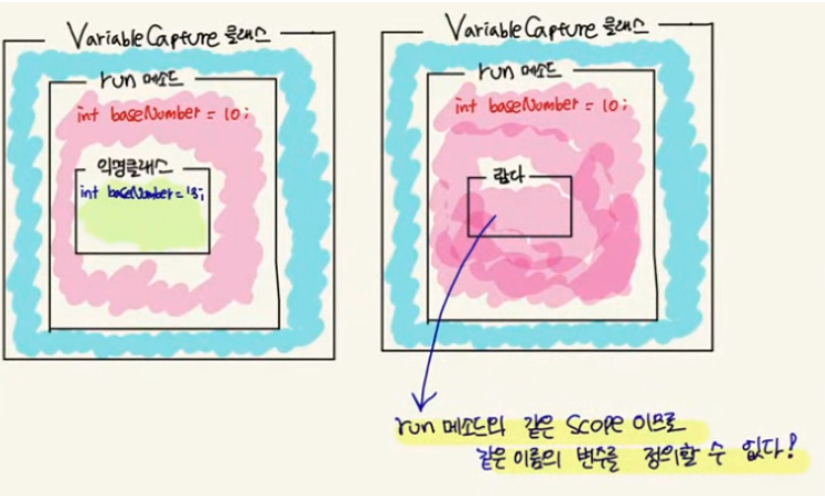 - 메소드를 람다식으로 표현하면 메소드의 이름과 반환값이 없으므로, 람다식을 '익명 함수(anonymous function)'이라고도 한다.