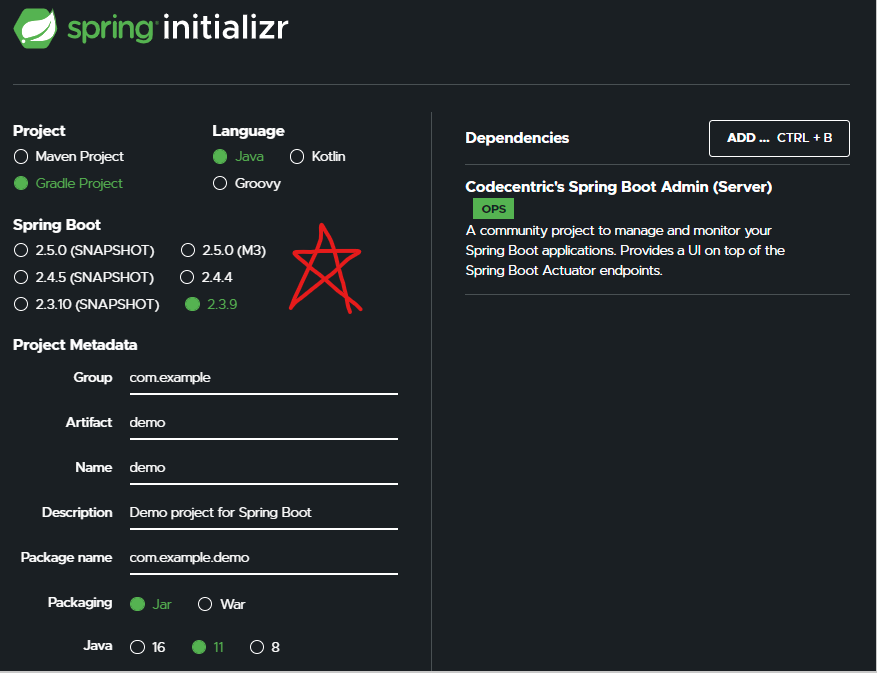 우선 admin 전용 서버를 띄우기 위해 프로젝트를 생성해야 한다. 멀티모듈로 해도되지만 필자는 그냥 start.spring.io를 통해서 프로젝트를 하나 생성했다.