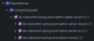 gradle 설정에서 위의 3개를 추가해준다. 서버에서의 설정한 admin-server의 버전이 2.3.1 이므로 클라이언트 애플리케이션에서도 맞춰준다.