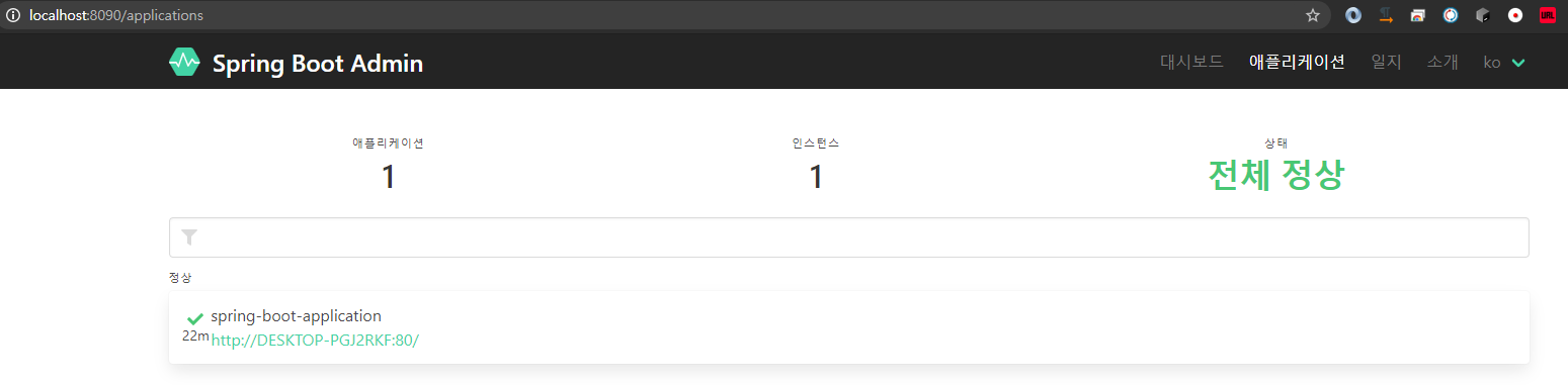 .yml 설정에서 위와같이 추가해준다. 필수 설정은 spring.boot.admin.client.url과 endpoints.web.exposure.include이다. url은 admin용 서버의 포트로 설정하면 된다.