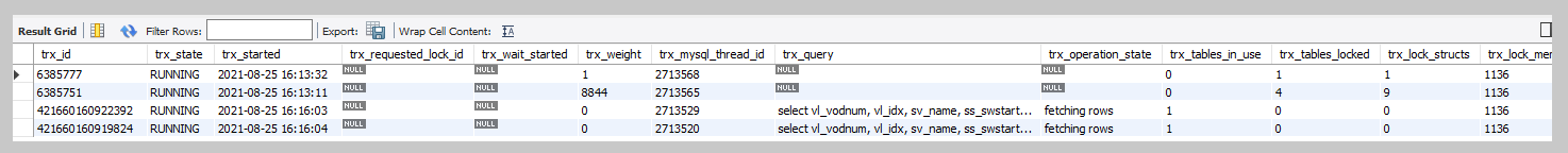 select * from INFORMATION_SCHEMA.INNODB_TRX;