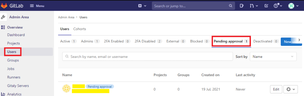 관리자 계정으로 들어가서 User > Pending approval 으로 들어가면 방금 가입한 계정이 보일것입니다. 우측 하단의 설정버튼을 눌러서 Approve를 해주면 됩니다.