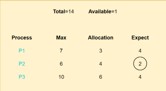 총 사용할 수 있는 자원이 1개입니다. 해당 자원으론 어느 프로세스의 기대 자원도 충족할 수 없습니다.
