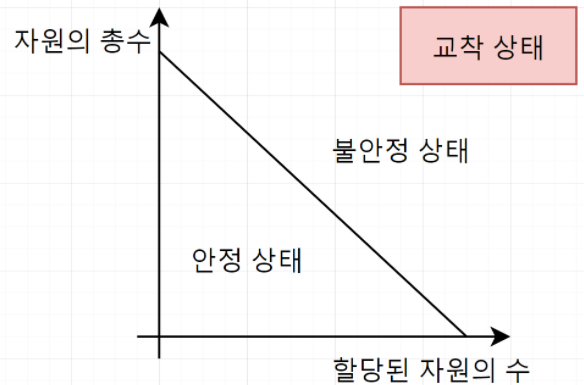 프로세스는 자원의 총수와 할당된 자원의 수를 기준으로 안전상태와 불안정 상태로 나눌 수 있습니다.
