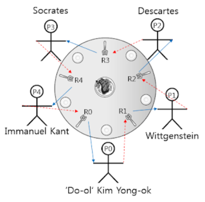 식사하는 철학자 문제 : 왼쪽 포크를 놓지 않고 다른 철학자들이 가지고 있는 포크를 강제로 빼앗을 수 없다.