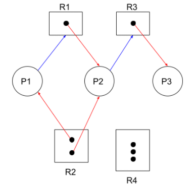 위 그림에서 동그라미(P1, P2, P3)은 프로세스, 사각형(R1, R2, R3, R4)은 자원타입, 사각형 안의 점들은 할당 가능한 자원의 인스턴스 개수입니다.