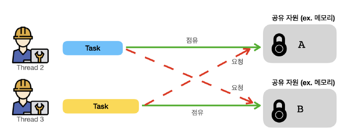 - Thread2는 A를 점유하고 있으면서 B의 자원을 요청, B의 자원을 습득할 때 까지 대기