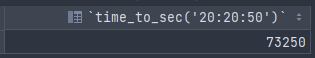 select time_to_sec('20:20:50'); -- 20시간 20분 50초를 초 데이터로 변환