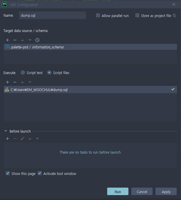 - Path to mysqldump: 로컬에 설치된 mysqldump.exe 설정