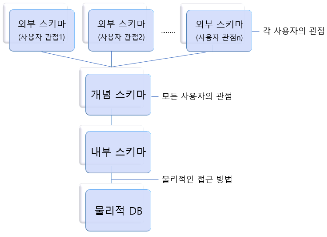 스키마는 사용자의 관점에 따라 외부 스키마, 개념 스키마, 내부 스키마로 나뉜다.
