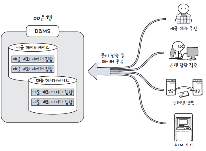 가까운 예로 은행이 가지고 있는 예금 계좌 데이터베이스에는 ATM 기기, 인터넷 뱅킹, 예금 계좌 주인, 은행 담당 직원 등 여러 명이 동시에 접근할 수 있어야 한다.