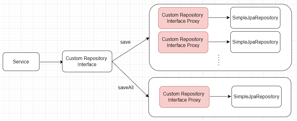 save()와 saveAll()이 모두 단일 트랜잭션으로 묶여 있더라도 save()를 호출한 수만큼 Custom Repository Interface의 프록시를 타게 되며, saveAll()은 Custom Repository Interface의 프록시를 한번만 탄 후에 save()를 내부 함수로 호출하여 프록시를 태우는 비용이 발생하지 않습니다.