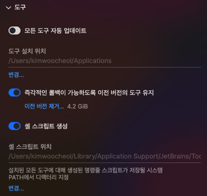 /Users/{사용자}/Library/Application Support/JetBrains/Toolbox/scripts