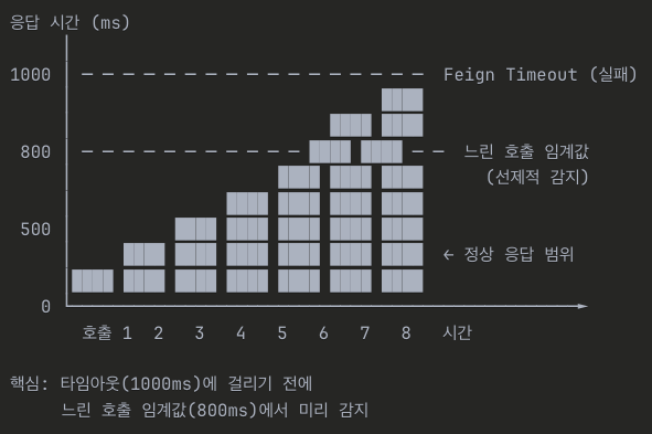 Circuit Breaker의 또 다른 강점은 "느린 호출"도 감지할 수 있다는 점입니다. 완전한 실패가 아니더라도, 응답이 비정상적으로 느려지는 것은 장애의 전조일 수 있습니다.