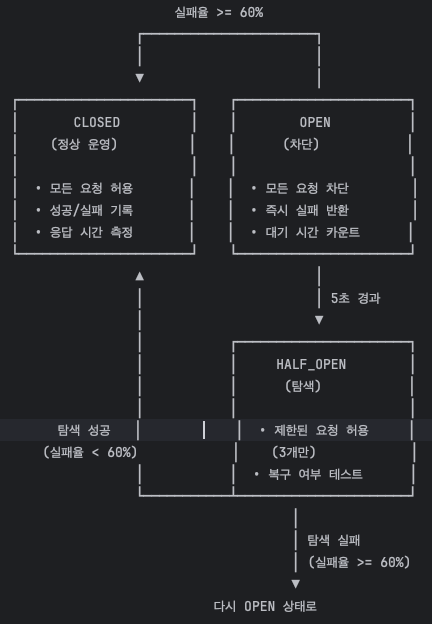 waitDurationInOpenState: 5s # OPEN 상태 유지 시간 (5초 후 HALF_OPEN으로 전환)