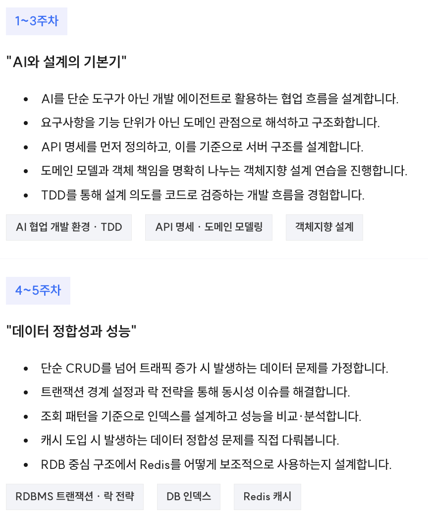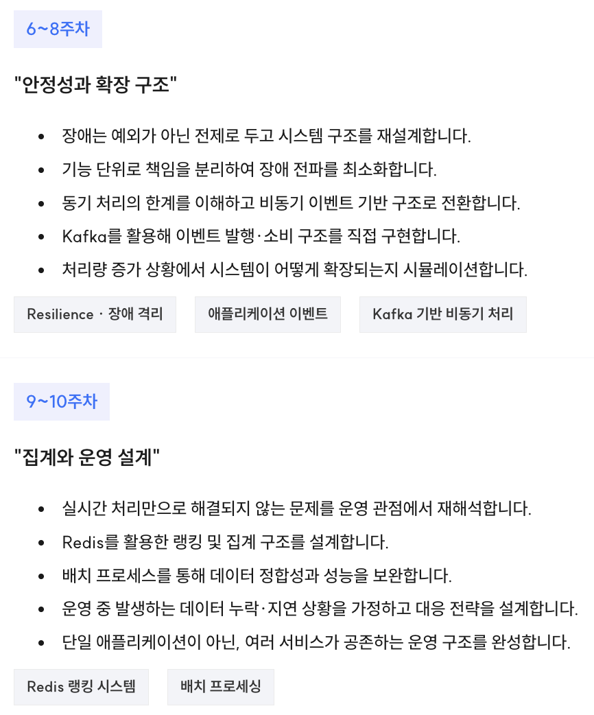 단순히 기술 나열이 아닙니다. 서비스를 만들고, 운영하고, 확장하는 전체 사이클을 경험할 수 있도록 설계되어 있습니다.